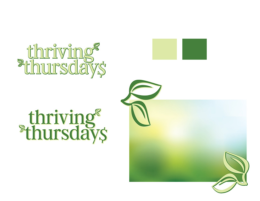 Thriving Thursdays event was an internal offering for clients of the company. The concept for this event brand was to develop a recognizable identity for a monthly educational lunch-and-learn that was from a monotone color palette of greens that were bright and approachable, yet professional and depicted closely the word “Thrive”. Because the graphic for the corporate brand is an olive tree, leaves were included in the graphic.